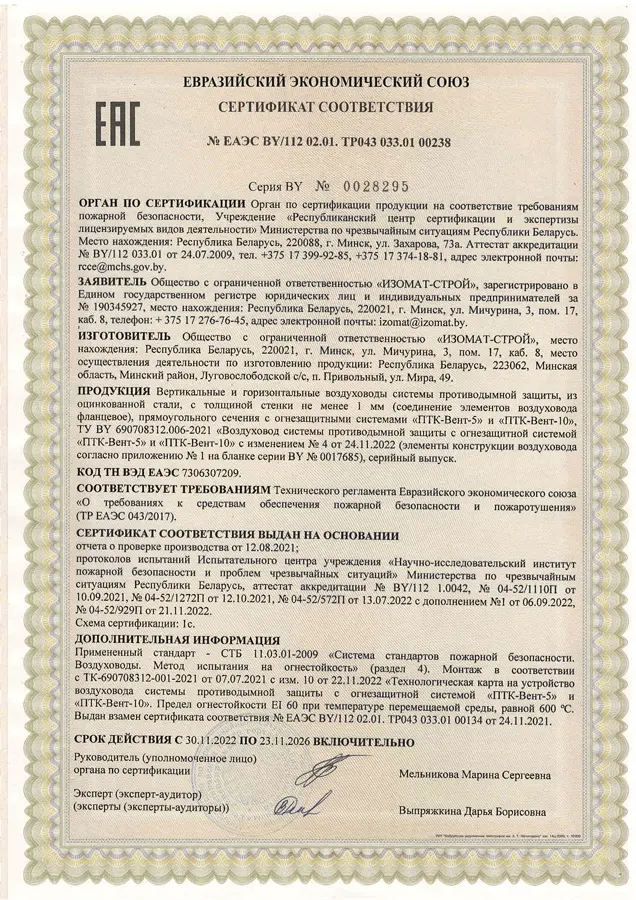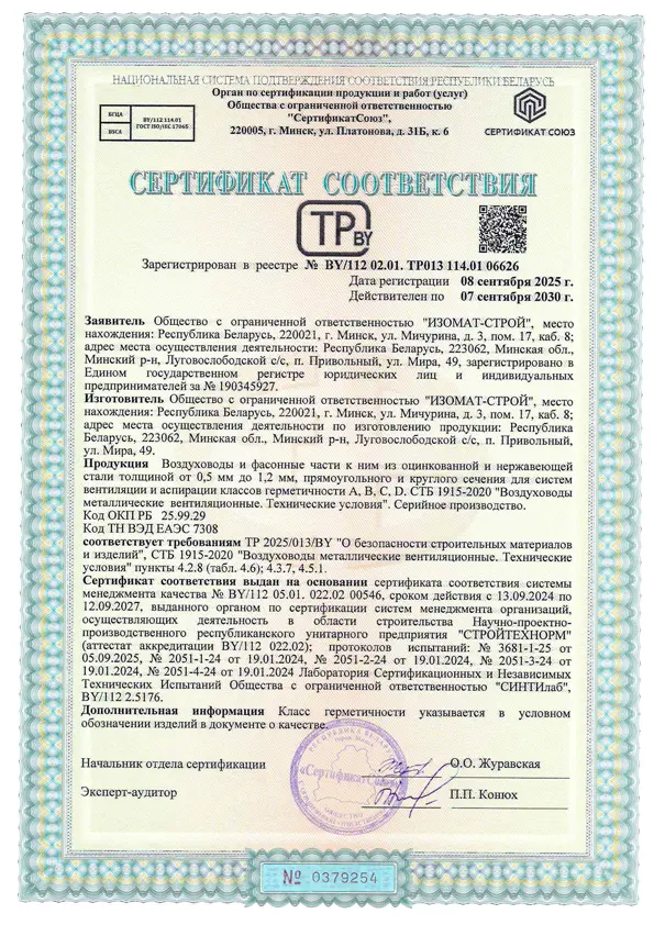Сертификат соответствия воздуховодов и фасонных частей к ним из оцинкованной и нержавеющей стали толщиной от 0,5 - 1,2 мм Посмотреть pdf
